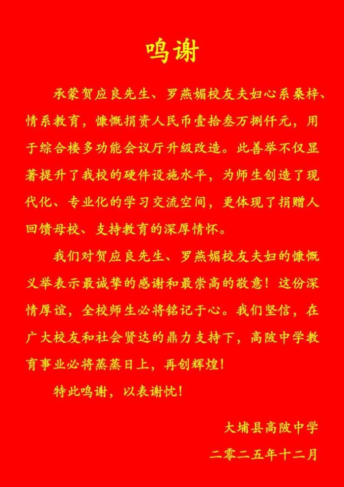 13.8万元!大埔高陂中学校友夫妇慷慨捐资